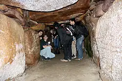 Die etwa 10 m lange und zwei Meter breite Kammer wird durch einen 7,5 m langen Gang erschlossen. Mit Ausnahme weniger Steine des Zwischenmauerwerks im äußeren Abschnitt ist die Anlage komplett. Der Gang besteht aus sieben Tragsteinpaaren, auf denen sechs Decksteine aufliegen. Die Kammer ist sehr regelmäßig und fast symmetrisch gebaut. 19 Tragsteine tragen sieben riesige Platten, die die Kammerdecke bilden. Die Kammerhöhe ist mit fast zwei Metern verhältnismäßig groß. Um den Hügelfuß waren große Randsteine mit Trockenmauerwerk in den Lücken aufgestellt. Flache Steinplatten wurden in der Kammer als Bodenmaterial benutzt.