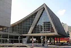 Unter der geschwungenen Hängekonstruktion aus Sichtbeton (Stahlkabel und Fertigelemente)[3] wurden die Kongressräume und das Hallenbad zusammengefasst und durch eine transparente Glaswand getrennt. Die Stirnseite zum Platz «Esplanade» verläuft im schrägen Winkel und ist geschlossen ausgebildet. Unter dem aufgeständerten Beton-Baukörper liegen überdeckte Freiflächen und verbinden sich mit dem Platz. Die Seiten der Welle und die Stirnseite des Hallenbades sind verglast. Insgesamt wirkt das Gebilde trotz des Betontragwerks dynamisch und leicht.[1]