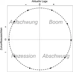 Theoretischer Konjunkturverlauf in der Konjunkturuhr, wie sie z. B. im Rahmen des ifo-Geschäftsklimaindex Verwendung findet. (Die Ifo bezeichnet abweichend das Konjunkturtief als Rezession.)