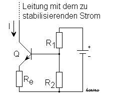Eine Konstantstromquelle kann im einfachsten Fall durch einen gegengekoppelten Bipolartransistor realisiert werden. Die Basis wird durch einen Spannungsteiler aus den Widerständen und auf einer konstanten Spannung gehalten. Der Transistor wird hierdurch leitend und führt einen gewissen Strom , der durch den Emitterwiderstand fließt, und an ihm nach dem ohmschen Gesetz eine Spannung hervorruft. Mit steigendem würde zugleich ansteigen. Damit wird aber der Emitter in seiner Spannung gegenüber der Basis angehoben, wodurch die Basis-Emitter-Spannung sinkt. Dies steuert den Transistor zu und lässt den Strom sofort wieder sinken. Würde sich andererseits verkleinern, so wird die Spannung am Emitterwiderstand kleiner und damit die Basis-Emitter-Spannung größer, wodurch sich der Kollektorstrom wieder erhöht. Diesen Vorgang der Stabilisierung nennt man auch Gegenkopplung, wodurch der ohnehin bereits relativ hohe Ausgangswiderstand des Transistors weiter vergrößert wird (siehe Bipolartransistor#Kennlinienfelder).