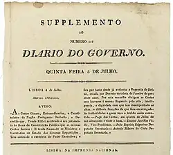 Auf der Grundlage der vom König vereidigten Verfassungsgrundlagen erarbeiteten und verabschiedeten die Cortes die erste portugiesische Verfassung, die am 30. September 1822 angenommen wurde, und am 4. November 1822 traten die Allgemeine, die Außerordentliche und die Konstituierende Cortes der portugiesischen Nation zum letzten Mal zusammen.