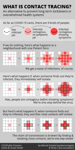 Kontaktpersonennachverfolgung wird als effiziente und kostengünstige medizinisch-epidemiologische Maßnahme beschrieben, um gezielt Ansteckungsketten von infektiösen Erkrankungen wie etwa den Pocken aufzudecken (Rückverfolgung von Infektionsketten).[6] Durch Kontaktpersonennachverfolgung könne vor allem bei Geschlechtskrankheiten eine Fülle von Informationen über das Ausbreitungsmuster einer infektiösen Erkrankung gesammelt werden und deren Ausbreitung letztlich auch – durch gleichzeitige Information aller an den Kontakten beteiligten Personen – eingedämmt werden.[7][8] Gegen die Ausbreitung von Influenza-Viren sei Kontaktpersonennachverfolgung gemäß Weltgesundheitsorganisation hingegen im Allgemeinen kaum eine geeignete Maßnahme.[9]