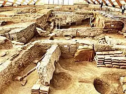 Çatalhöyük, die wohl bekannteste Siedlung ihrer Art etwa 10 km nordöstlich von Çumra am Ufer des ehemaligen Çarşanba Çayı, ist ein Platz mit urbanem Charakter. Er wurde 1951 vom britische Prähistoriker und Archäologen James Mellaart entdeckt, dessen detaillierten Voruntersuchungen sich bis 1958 erstreckten. Bei den Ausgrabungen seit 1961 auf einer Fläche von etwa 13 Dekar (1,3 Hektar) stieß man auf 14 Gebäudeschichten, die nach Mellaart einer urbanen Gesellschaft in Art einer „Metropole“ ähnelten. Mellaarts Ausgrabungen dauerten bis 1964, als ihm im Zusammenhang mit der Dorak-Affäre die Grabungserlaubnis entzogen worden war. Nach einer langen Pause wurde die Ausgrabung 1993 unter Ian Hodder (Universität Cambridge) zusammen mit Rogers Matthews (Britisches Archäologisches Institut, Ankara) wieder aufgenommen. Bisher wurden 16 Siedlungsebenen ausgegraben.[47] Auf die Siedlung aus der Jungsteinzeit in Çatalhöyük folgt die Siedlung aus der Kupfersteinzeit (Chalkolithikum) auf dem westlich anschließenden Hügelteil (West-Çatalhöyük). Diese Periode ist die erste Phase des „Metallzeitalters“ (Metallverarbeitung) und beginnt um 5500 v. Chr.[48] Ansehnliche Funde befinden sich im sogenannten „Hethiter-Museum“ (Museum für anatolische Zivilisationen / Anadolu Medeniyetleri Müzesi) in Ankara.