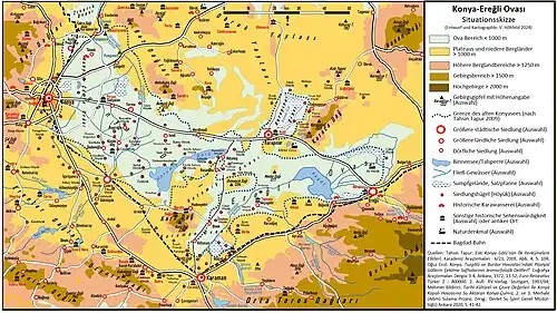 Die Karte zeigt die historisch-topographische Situation der Konya-Ereğli Ovası, einer ausgedehnten Senkenlandschaft im südwestlichen Inneranatolien.