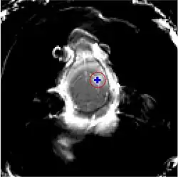 Der Fokus des Ultraschalls kann auf beliebige Areale im Gehirn gerichtet werden. Dadurch kann die Blut-Hirn-Schranke selektiv, auf bestimmte Hirnareale begrenzt, geöffnet werden. So können applizierte Wirkstoffe gezielt in diese Areale diffundieren.[140] Die behandelten Areale lassen sich durch eine simultan laufende Magnetresonanztomographie (MRT) genau verfolgen. Dabei dringt das für die MRT verwendete Kontrastmittel, beispielsweise Gadopentetat-Dimeglumin, nur durch die geöffneten Areale der Blut-Hirn-Schranke in das Gehirn ein. Diese Bereiche werden dadurch im MRT deutlich sichtbar hervorgehoben. Das hochpolare Gadopentetat-Dimeglumin ist nicht in der Lage die ungeöffneten Bereiche der Blut-Hirn-Schranke zu passieren.