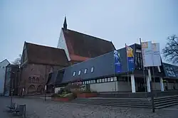 Das rechteckige Gebäude mit Satteldach ist ein dreischiffiger gotischer Backsteinbau mit sechs Jochen. Die beiden Giebel sind verputzt. Der Westgiebel ist mit Mustern aus Backsteinen verziert. Der einschiffige, gerade geschlossene Chor ist dreijochig ausgeführt und drei Meter niedriger als das Langhaus. Dessen Giebel ist mit gotischen Fensterformen gestaltet. Die Nord- und Südseite des Langhauses sind mit sechs Fenstern und die Westseite mit drei Fenstern gegliedert, die über die gesamte Höhe der Fassade gehen. An der Südseite befinden sich zwei doppelflüglige Tore. Von den zwei 2,90 m hohen, von Axel Schulz gestaltete Bronzetoren wird das eine „Heiteres Tor“ und das andere „Ernstes Tor“ genannt. Jede der vier Torflügel hat vier Felder mit Motiven. Den oberen Abschluss bildet bei beiden Toren ein halbkreisförmiger Rundbogen, der als Baum gestaltet ist. Im Norden schließt sich auf der gesamten Länge ein zweigeschossiger Funktionsanbau mit Atrium an.