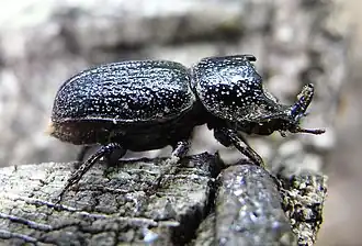 Die Käfer erreichen eine Körperlänge von 12 bis 16 Millimetern und haben einen stark glänzenden, schwarz gefärbten Körper. Der Körper ist walzenförmig und die Elytren besitzen deutliche Kettenreihen. Die Männchen tragen auf dem Kopf ein deutlich ausgebildetes Horn, das bei den Weibchen deutlich kleiner ist. Außerdem sind die Aushöhlungen am Halsschild beim Weibchen sehr viel seichter als die deutlichen Höhlungen beim Männchen.