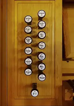 | III/I 4′ | Das III. Manual wird eine Oktave höher spielend an das I. Manual gekoppelt | Beim Spiel im I. Manual klingt es, als würde zusätzlich im III. Manual dasselbe eine Oktave höher gespielt |