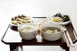 - ↑ Der Begriff Bapsang (kor. 밥상, rev. bapsang, MR papsang, deutsch: ‚Esstisch‘) bezeichnet hier gewöhnlich ein typisches mit koreanische Speisen gedeckter Esstisch. Dazu gehören zum Beispiel Reis als Grundnahrungsmittel, eine Suppe und verschiedene kleine koreanische Beilagen (meist zwei bis drei Banchan).