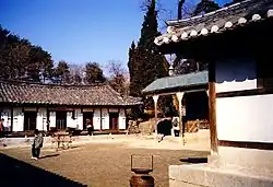 Traditionelle koreanische Häuser bestehen aus einem inneren Flügel (Anchae) und einem äußeren Flügel (Sarangchae). Das individuelle Layout ist abhängig von der Region und dem Reichtum der Familie. Aristokraten benutzen den äußeren Flügel für Empfänge, aber Bauern hielten dort das Vieh und die Vorräte. Allgemein galt, je reicher die Familie, desto größer das Haus, aber es war allen Familien verboten eine Residenz von mehr als 99 Kan zu haben. Ein Kan ist die Fläche zwischen zwei Holzpfeilern der Außenwand, wie sie in traditionellen Häusern verwendet wurden.