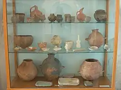 Verschiedenste Keramikgefäße und Gruppen von zusammengehörigen Scherben wurden unregelmäßig verteilt innerhalb der Befestigung aufgefunden, ein Großteil davon im Eingangsbereich zur Festung. In einem Korridor im Innenraum fand man zwei einhenkelige Trichterhalsbecher, eine enghalsige Amphore mit Horizontalgriffen, einen henkellosen Krater und eine charakteristische enghalsige Kanne.[16] Die Untersuchung der Keramikformen ergab zwei Gefäßkategorien, offene Formen für den Alltagsgebrauch und Lebensmittelkonsum und größere geschlossene Formen für die Konservierung und Lagerung von Flüssigkeiten und Lebensmitteln; der Anteil dieser Vorratsgefäße lag bei nahezu zwei Dritteln. Der Großteil der Gefäße war auf der Innen- und Außenseite mit einem dünnen matten Überzug in braun oder rotbraun versehen, Ausnahmen mit glänzendem rotbraunen äußeren Überzug sind ein Gefäß in Tiergestalt sowie ein Henkelkrug. Weniger als 30 Prozent der Gefäße sind mit Reliefs oder Ritzdekor verziert. Töpfermarken sind relativ selten.