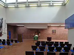 Der Gebäudekomplex hat mehrere Baukörper. An die zuerst errichtete Kindertagesstätte wurde die Kirche angebaut. Das Gemeindehaus steht frei. Die verschachtelten Quader des Gebäudetrakts bilden gestaffelte Geschosse. Zwei Türen führen in den niedrigen Vorraum der Kirche. Rechts befindet sich das Kirchencafé, links sind die Toiletten. Durch eine weitere Tür wird das Langhaus betreten. Es hat einen quadratischen Grundriss und bietet 180 Sitzplätze. Hier ist das Bauwerk am höchsten. Bei Bedarf kann die Zahl der Sitzplätze durch Öffnen zweier Schiebetüren erweitert werden. Bei geschlossenen Schiebetüren befindet sich vor der Altarwand ein Querschiff. Dieser Bereich ist eingeschossig, ebenso der hinter den Schiebetüren. Das hohe Langhaus wird ringsum durch Obergaden erhellt, ferner durch kreuzförmig angeordnete Oberlichte auf dem Flachdach. Direkt über dem einfachen hölzernen Altartisch hat das Flachdach einen Aufsatz, durch den Licht auf den Altar fällt.