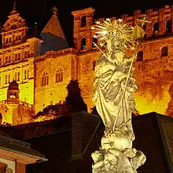 - ↑ a b Eva Hofmann: Der Muttergottesbrunnen auf dem Kornmarkt. In: Gertrud P. Fels u. a.: Heidelberger Altstadtbrunnen. Guderjahn, Heidelberg 1996, ISBN 3-924973-55-5, S. 83.