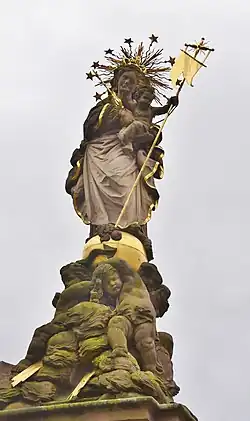 Maria mit vergoldeter Strahlenkrone, Sternenkranz und Lilienzepter trägt das Jesuskind auf dem linken Arm und stützt es mit der rechten Hand. Sie steht auf einer ebenfalls vergoldeten und von einer Drachenschlange umwundenen Weltkugel, die von vier Putten auf einem Wolkengebilde getragen wird, wobei die Wolken von goldenen Strahlen durchdrungen sind. Das Jesuskind hat die rechte Hand zu einer Segensgeste erhoben, mit der linken stößt er eine Lanze mit Kreuz in den Kopf der Drachenschlange.