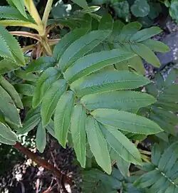 Die Blättchen sind bei einer Länge von 9 bis 15 cm und einer Breite von 2 bis 5 cm eiförmig, -lanzettlich bis verkehrt-eiförmig, -eilanzettlich oder elliptisch mit schiefer, stumpfer bis leicht herzförmigen Basis und spitzem oder bespitztem oberen Ende. Der Rand ist gesägt bis gezähnt und bewimpert, er besitzt seidige Haare, wobei die Blattzähne meist in einer verdickten Drüse enden. Die Oberseite der Blättchen ist hell oder leuchtend grün und auf der Unterseite befinden sich weißliche Haare. Die Blättchen sind fiedernervig und auf der Unterseite sind die Blattadern erhaben und seidig behaart.[3]