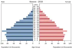Zur Volkszählung 2011 hatte die Republik Kosovo rund 1,8 Millionen Einwohner. Die durchschnittliche Geburtenrate (TFR) liegt bei 2,3 Kindern pro Frau (Stand 2015).[25] Die Bevölkerung ist die durchschnittlich jüngste innerhalb Europas:[26] Im Jahr 2006 waren 33 % unter 16 Jahre alt, über die Hälfte der Bevölkerung war jünger als 25 Jahre, nur 6 % über 65 Jahre. Zahlen aus dem Jahr 2017 besagen, dass auch hier ein Alterungsprozess eingetreten ist. Zu diesem Zeitpunkt war die Hälfte der Bevölkerung jünger als 29,1 Jahre.[27] Die Geburtenrate übertrifft die Sterberate derzeit deutlich: 23 Geburten pro 1000 Einwohner standen im Jahr 2003 sieben Todesfälle pro 1000 Einwohner gegenüber. Die Lebenserwartung für Frauen beträgt 71, die der Männer 67 Jahre. Der Anteil der Landbevölkerung liegt zwischen 60 und 65 %. Zusätzlich zu den rund 1,8 Millionen Einwohnern des Kosovo leben und arbeiten etwa 420.000 Kosovaren im Ausland, vor allem in Deutschland, den Vereinigten Staaten, Österreich und der Schweiz.[28]
