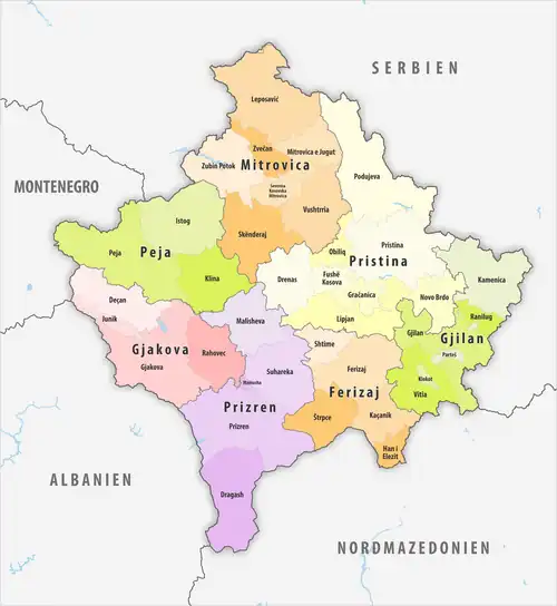 Die Republik Kosovo, kurz der/das Kosovo (albanisch Kosovë/Kosova, serbisch Косово Kosovo), ist eine Republik in Südosteuropa auf dem westlichen Teil der Balkanhalbinsel. Sie hat etwa 1,8 Millionen Einwohner, die Kosovaren genannt werden, und gilt als ein De-facto-Staat[10] oder weiterhin stabilisiertes De-facto-Regime[11]. Die Hauptstadt und größte Stadt des Kosovo ist Pristina.