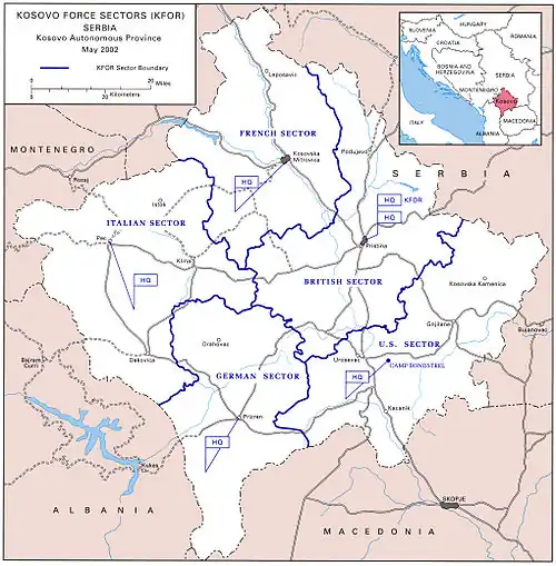 Bei formeller Wahrung der Zugehörigkeit zur Bundesrepublik Jugoslawien wurde Kosovo nach dem Krieg im Jahr 1999 unter die Verwaltungshoheit der Vereinten Nationen gestellt.[13] Völkerrechtliche Grundlage war hierbei die Resolution 1244 des UN-Sicherheitsrates, welche die Souveränität und territoriale Unversehrtheit der Bundesrepublik Jugoslawien garantiert, deren Rechtsnachfolger das heutige Serbien ist. Zudem wird die politische Entwicklung seit dem 9. Dezember 2008 durch die EULEX Kosovo überwacht. Dies gilt auch für die überwiegend von Serben bewohnte Region Nordkosovo, die von der Regierung in Pristina derzeit nur beschränkt kontrolliert wird.[14]