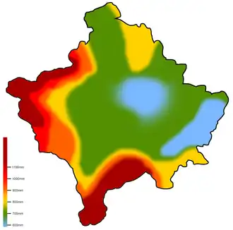 Für den gesamten Kosovo gilt, dass der Dezember und der Januar zu den kältesten Monaten und der Juli und der August zu den wärmsten Monaten des Jahres zählen. Der meiste Niederschlag fällt zwischen Oktober und Dezember.[21]