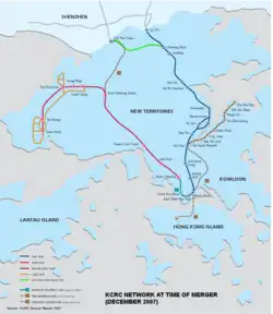 2007 wurden die KCR-Linien in das Mass Transit Railway (MTR) integriert. Die MTR Corporation betreibt die KCR-Eisenbahnnetzinfrastruktur für zunächst 50 Jahre, die jedoch im Besitz der Kowloon-Canton Railway Corporation, kurz KCRC (九廣鐵路公司, kurz 九鐵公司)[11] verblieb. Die KCRC wiederum gehört der Regierung von Hongkong. Als Teil des geplanten Zusammenschlusses wurde die KCR East Rail, KCR West Rail und die KCR Ma On Shan Rail umbenannt in East Rail Line, West Rail Line und Ma On Shan Line. Die Mong Kok Station an der East Rail wurde umbenannt in Mong Kok East Station.