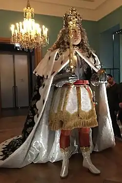 Zur Erlangung der Würde eines polnischen Königs war August I., Kurfürst und Herzog von Sachsen, von der evangelisch-lutherischen Konfession zum Katholizismus gewechselt. Um den polnischen Adel zur Zustimmung zu bewegen, soll er 39 Millionen Reichstaler aufgewendet haben, zu einem erheblichen Teil durch Kredit finanziert, letztlich aufgebracht durch die Einwohner Sachsens.[5] Des Herzogs Gemahlin Christiane Eberhardine hatte die polnische Königswürde ausgeschlagen und ihr evangelisches Glaubensbekenntnis behalten. Die Krönungszeremonie fand am 15. September 1697 in der Wawel-Kathedrale des Schlosses zu Krakau ohne seine Frau statt, die sich geweigert hatte mitzufahren.