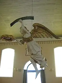 Im Inneren der Kirche befindet sich eine Patronatsloge mit Medaillonbildern und hohen, schmalen, verzierten Säulen. Das mittlere Brüstungsfeld zeigt ein Bild des Salvator Mundi. Der Kanzelaltar ist mit einer Empore und der Orgel Opus 405 des Orgelbauers Wilhelm Sauer[23] aus dem Jahr 1883 verbunden. Der Schalldeckel wird von zwei Engeln getragen. Im Altarraum befindet sich eine sechsseitige Taufe aus Holz. In der Mitte des Kirchenschiffs hängt ein Taufengel aus der Barockzeit. Zwischen 1883 und 1887 wurden 13 bunte bleiverglaste Kirchenfenster vom Gutsbesitzer Ferdinand Möhring gestiftet, sechs sind noch erhalten.