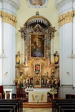 Der Hochaltar wurde 1857 errichtet und teilweise von dem Kunstatelierinhaber Ferdinand Scheck (1827–1891) gefertigt. Der Tabernakel mit zwei anbetenden Engeln stammt aus der Kapelle des Rekonvaleszentenheimes St. Theresia der Barmherzigen Brüder in Wien. Die flankierenden Statuen stellen die Erzengel Raphael (Patron des Ordens) und Michael (Patron der österreichischen Ordensprovinz) dar. Das Hochaltarbild mit dem Motiv Maria Immaculata (die unbefleckte Empfängnis Mariä) schuf Martin Johann Schmidt (Kremser Schmidt) und ist mit 1773 datiert. Über dem Hochaltar befindet sich ein ovales Fresko, das mit Stuckrahmen umgeben ist und Gottvater mit Szepter sowie den Erzengel Michael mit Waage darstellt. Unterhalb des Hochaltarbildes ist ein weiteres Bild, das die Heilige Familie darstellt. Es wurde von Marzik Thomas 1854 gemalt und ist eine Kopie des Bildnisses in der Barmherzigen-Brüder-Kirche in Wien.[10]
