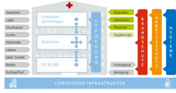 Ein Krankenhaus setzt sich aus verschiedenen medizinischen Teilbereichen wie den Funktionsabteilungen, den Stationen, dem OP-Bereich und der Zentralen Notaufnahme (ZNA) zusammen. Die Teilbereiche bilden zusammen mit den zahlreichen Informations-, Personen- und Warenströmen die logistische Infrastruktur. Ergänzt werden diese von zuliefernden Bereichen wie etwa der Küche, dem Lager oder der Apotheke. Krankenhauslogistik charakterisiert sich zudem durch die Steuerung und Koordination dieser logistischen Ströme.