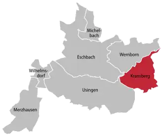 Nach dem Krieg errichteten die Kransberger im Jahr 1952 als eine der ersten Gemeinden in Hessen ein Dorfgemeinschaftshaus. Im Zuge der Gebietsreform in Hessen wurde zum 31. Dezember 1971 die bis dahin selbständige Gemeinde Kransberg auf freiwilliger Basis in die Stadt Usingen eingemeindet,[5] zugleich wurde der Ortsteil Friedrichsthal nach Wehrheim umgegliedert.[6] Für den Stadtteil Kransberg wurde, wie für die anderen eingemeindeten ehemals eigenständigen Gemeinden, ein Ortsbezirk eingerichtet.[7]