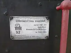 - ↑ a b c d e Bogdan Pokropiński: Muzealne Parowozy wąskotorowe w polsce, Muzeum Ziemi Pałuckiej (dla Toru Szerokości 750 mm), Żniń 2007. ISBN 83-88795-08-2. Seite 82