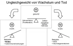 In einem gesunden Organismus werden die Zelltypen, aus denen sich die verschiedenen Gewebe der Organe aufbauen, in einem ausgewogenen artspezifischen Gleichgewicht gebildet und regeneriert, was als Homöostase bezeichnet wird. In diesem Zustand der Homöostase gibt es ein Gleichgewicht zwischen der Vermehrung von Zellen (Zellproliferation) und dem Zelltod. Der Hauptanteil des Absterbens von Zellen erfolgt dabei durch Apoptose, bei der die Zellen „Selbstmord“ begehen. In pathologischen Situationen kann dieses Absterben auch durch Nekrose geschehen. Bei Krebs ist dieses Gleichgewicht zugunsten des Zellwachstums verändert. Die Krebszellen wachsen dabei ungehindert, da hemmende Signale nicht erkannt oder nicht ausgeführt werden. Der Grund liegt in Defekten der Erbinformation, die durch Mutationen entstanden sind.