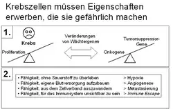 Durch weitere Veränderungen der DNA kann die Zelle zusätzliche Eigenschaften ausbilden, die eine Behandlung der Krebserkrankung erschweren, darunter die Fähigkeit, unter Sauerstoffmangel zu überleben, eine eigene Blutversorgung aufzubauen (Angiogenese) oder aus dem Verband auszuwandern und sich in fremden Geweben wie Knochen (Knochenmetastase), Lunge (Lungenmetastase), Leber (Lebermetastase) oder Gehirn (Hirnmetastase) anzusiedeln (Metastasierung). Erst durch diese Fähigkeit gewinnt der Krebs seine tödliche Potenz: 90 % aller Krebspatienten, bei denen die Krankheit tödlich ausgeht, sterben nicht am Primärtumor, sondern an den Folgekrankheiten der Metastasierung.