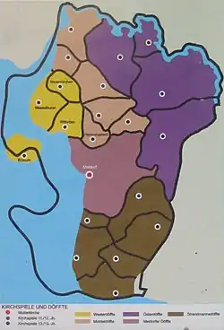Die Dithmarscher Urkirchspiele. In Schwarz: die heutige Küstenlinie