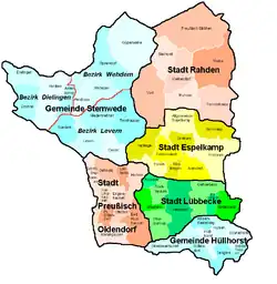 | Amt Rahden | Großendorf, Kleinendorf, Sielhorst, Ströhen, Varl, Wehe | Kleinendorf, Preußisch Ströhen, Rahden, Sielhorst, Tonnenheide, Varl, Wehe |