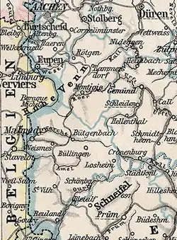 Der Kreis Malmedy wurde 1816 im preußischen Regierungsbezirk Aachen gebildet und war in die fünf Bürgermeistereien Bellevaux, Büllingen, Bütgenbach, Malmedy und Weismes gegliedert. Das Gebiet gehörte ursprünglich zum Herzogtum Limburg und wurde infolge des Wiener Kongresses 1815 preußisch. Am 1. Februar 1821 wurde der ebenfalls 1816 gegründete Nachbarkreis Sankt Vith in den Kreis Malmedy eingegliedert, wodurch zehn weitere Bürgermeistereien zum Kreis Malmedy kamen. Mit der Einführung der Gemeindeordnung für die Rheinprovinz von 1845 wurden die meisten Bürgermeistereien des Kreises in Gemeinden untergliedert. Malmedy und Sankt Vith erhielten 1856 die Rheinische Städteordnung. Außerdem wurde im Verlauf des 19. Jahrhunderts die Bürgermeisterei Thommen aufgehoben und die Bürgermeisterei Bevercé neu eingerichtet. Im Kreis Malmedy bestanden zuletzt auf einer Fläche von 813 km² zwei Städte und 43 weitere Gemeinden:[1] Heute noch erinnern die alten Belgisch-Preußischen Grenzsteine an den ehemaligen Verlauf der Grenze.