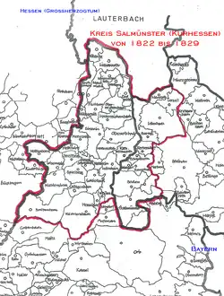 Der Kreis Salmünster wurde 1821 aufgrund einer kurfürstlichen Verordnung als ein Kreis der kurhessischen Provinz Hanau gebildet.[1] Dazu gehörte auch die einheitliche Einteilung des Kurstaates in Provinzen, die sich wiederum in Kreise gliederten. Bei seiner Gründung hatte der Kreis Salmünster 16.611 Einwohner.[2]