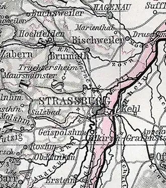 Nachdem Elsaß-Lothringen durch den Frankfurter Friedensvertrag an das Deutsche Reich gefallen war, wurde 1871 aus dem bis dahin französischen Arrondissement Strasbourg der Landkreis Straßburg gebildet.[2] Die Stadt Straßburg blieb kreisfrei. Nach dem Ende des Ersten Weltkrieges wurde der Kreis 1918 von Frankreich besetzt, kam am 17. Oktober 1919 unter französische Verwaltung und gehörte mit dem Inkrafttreten des Versailler Vertrages am 10. Januar 1920 wieder als Arrondissement Strasbourg-Campagne dem französischen Staat an. Im Zweiten Weltkrieg stand Elsaß-Lothringen von 1940 bis 1944 unter deutscher Besatzung. Während dieser Zeit bildete das Gebiet des Arrondissements Strasbourg-Campagne den Landkreis Straßburg.[3] Der Kreis wurde nicht im völkerrechtlichen Sinne annektiert, sondern war dem Gauleiter für den Gau Baden in Karlsruhe unterstellt. Zwischen November 1944 und Februar 1945 wurde das Kreisgebiet durch alliierte Streitkräfte zurückerobert und an Frankreich zurückgegeben.