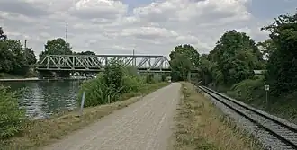 ![]() Gleis 2 Ost der Kreisbahn (re.) am Wesel-Datteln-Kanal, im Hintergrund die Brücke der VzG-Strecke 2270 (Oberhausen Hbf – Emmerich Grenze), 2018 | |||||||||||||||||||||||||||||||||||||||||||||||||||||||||||||||||||||||||||||||||||||||||||||||||||||||||||||||||||||||||