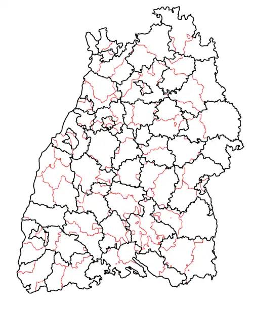 Mit Wirkung vom 1. Januar 1973 fand in Baden-Württemberg eine Kreisgebietsreform statt, bei der 32 Landkreise neu gebildet wurden und drei Landkreise unverändert oder nahezu unverändert bestehen blieben. Bereits in den Jahren zuvor, d. h. seit 1967, hatte es zur Vorbereitung der Kreisreform Umgliederungen einzelner Gemeinden gegeben.[1] Außerdem lief seit 1970 die freiwillige Phase der Gebietsreform in Baden-Württemberg, in der es bereits mehrere Gemeindezusammenschlüsse über die Kreisgrenzen hinweg gegeben hatte.[2]