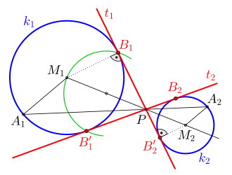 Konstruktion mittels Punkt P, dem Ähnlichkeitszentrum der beiden Kreise.