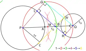 Um den Schnittpunkt A von ☉P mit der Strecke PQ wird ein Kreis mit Radius rQ geschlagen, der PQ zwischen A und Q in B schneidet (lindgrün). Der Abstand von B zu P ist somit gleich der Summe der Radien der gegebenen Kreise. Um P wird ein Kreis durch B geschlagen und mit dem Thaleskreis in G zum Schnitt gebracht (grün).