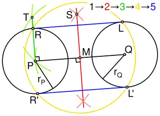 Die andere gemeinsame äußere Tangente ergibt sich z. B. durch Achsenspiegelung an der Zentrallinie: Schlagen eines Kreises um P durch R, was im anderen Schnittpunkt mit ☉Q den Spiegelpunkt R' ergibt, und durch Schlagen eines Kreises um Q durch L, was im anderen Schnittpunkt mit ☉P den Spiegelpunkt L' ergibt. Die andere Tangente ist dann die Gerade L'R' (gelb im Bild).