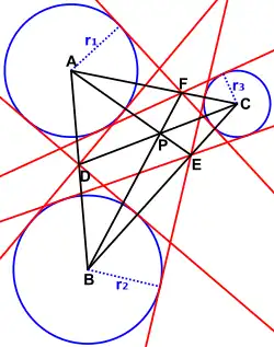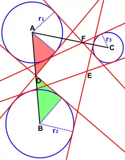Paarweise innere Tangenten bei drei Kreisen (rechts Beweisfigur)