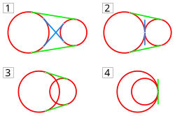 vier gemeinsame Tangenten, nämlich zwei äußere und zwei innere, wenn die Kreise keine gemeinsamen Punkte haben und sich nicht umschließen,