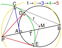 Eine weitere Konstruktionsmöglichkeit, die ohne den Mittelpunkt des Kreises auskommt, benutzt eine durch den Tangentenpunkt P führende, aber ansonsten beliebige Sekante AB des gegebenen Kreises,[1] wobei B der P fernere Punkt ist, siehe Bild rechts. Der Thaleskreis über PB (gelb) wird von einer Senkrechten von PB durch A in C geschnitten (blau). Der um P geschlagene Kreis durch C (grün) schneidet den gegebenen Kreis in seinen Berührungspunkten D und E mit den Tangenten (rot). Denn nach dem Satz von Thales ist im Dreieck ΔPBC der Winkel ∠PCB ein Rechter und der Höhensatz besagt