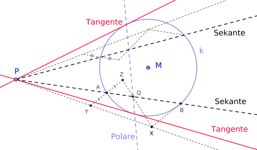 Wenn ein Punkt P außerhalb des Kreises gegeben ist, durch den die Tangente gehen soll, so muss zunächst der Berührpunkt gefunden werden. Da hierbei ein rechter Winkel entstehen muss, hilft der Satz des Thales: Man verbindet den Punkt P mit dem Kreismittelpunkt M und zeichnet über der Strecke [PM] den Thaleskreis. Dieser schneidet den Kreis k in zwei Punkten, die als Berührpunkte geeignet sind. Man erhält also durch den Punkt P zwei mögliche Kreistangenten. Die durch die beiden Berührpunkte bestimmte Gerade heißt Polare des Punktes P bezüglich des Kreises k.