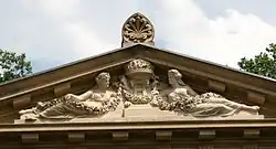 Die Mitte des Giebels bildet die Ewige Flamme, die aus einer mit Widderköpfen verzierten Schale emporsteigt. Zwei Frauengestalten, die die Schale flankieren sind einander zugewandt. Sie tragen antikisierende Gewänder und schwere Blumengebinde. Unter dem Giebel ist ein Metopen- und Triglyphenfries angebracht. Er zeigt abwechselnd eine geflügelte Sanduhr und eine strahlende Sonne als Symbole für den Tod und das Leben bzw. die Auferstehungshoffnung.