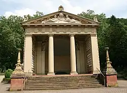 Der aus hellem Keuper-Sandstein errichtete Hauptteil des Gebäudes hat die Form eines antiken Tempels. Sein Giebel wird von den zu Pilastern ausgearbeiteten Enden der Seitenwänden und zwei dorische Säulen getragen. Blickfang der Fassade bildet der plastische Schmuck des Giebels. Der Fabrikant Fritz Landfried jun. stiftete ihn einige Jahre nach Vollendung des Baus.