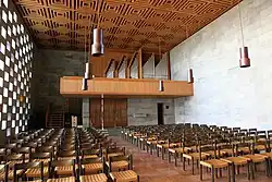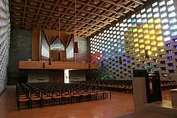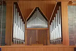 Die Firma Orgelbau Kuhn errichtete für die Halle II im Jahr 1966 eine Orgel, die ursprünglich 14 Register auf 2 Manualen und Pedal hatte. Gedeckt 16' im ersten Manual wurde kurz nach der Einweihung auf einer elektrischen Zusatzlade angefügt. Die Schalmei 8' im Schwellwerk wurde ebenfalls nachträglich eingebaut.[15]
