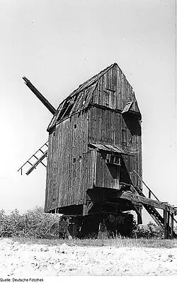 - Die Bockwindmühle Kremkau steht unter Denkmalschutz.[4] Bis 1960 wurde hier noch Mehl gemahlen.[26] Seit den 1870er-Jahren steht sie auf einem dünenartigen Sandhügel südlich des Dorfes. Vorher stand sie auf dem etwa 48 Meter hohen Mühlberg südwestlich des Dorfes.[11] 2021 wurde von einer kleinen Initiativgruppe berichtet, die eine gemeinsame Nutzung der Mühle für das Dorf erreichen möchte.[38]